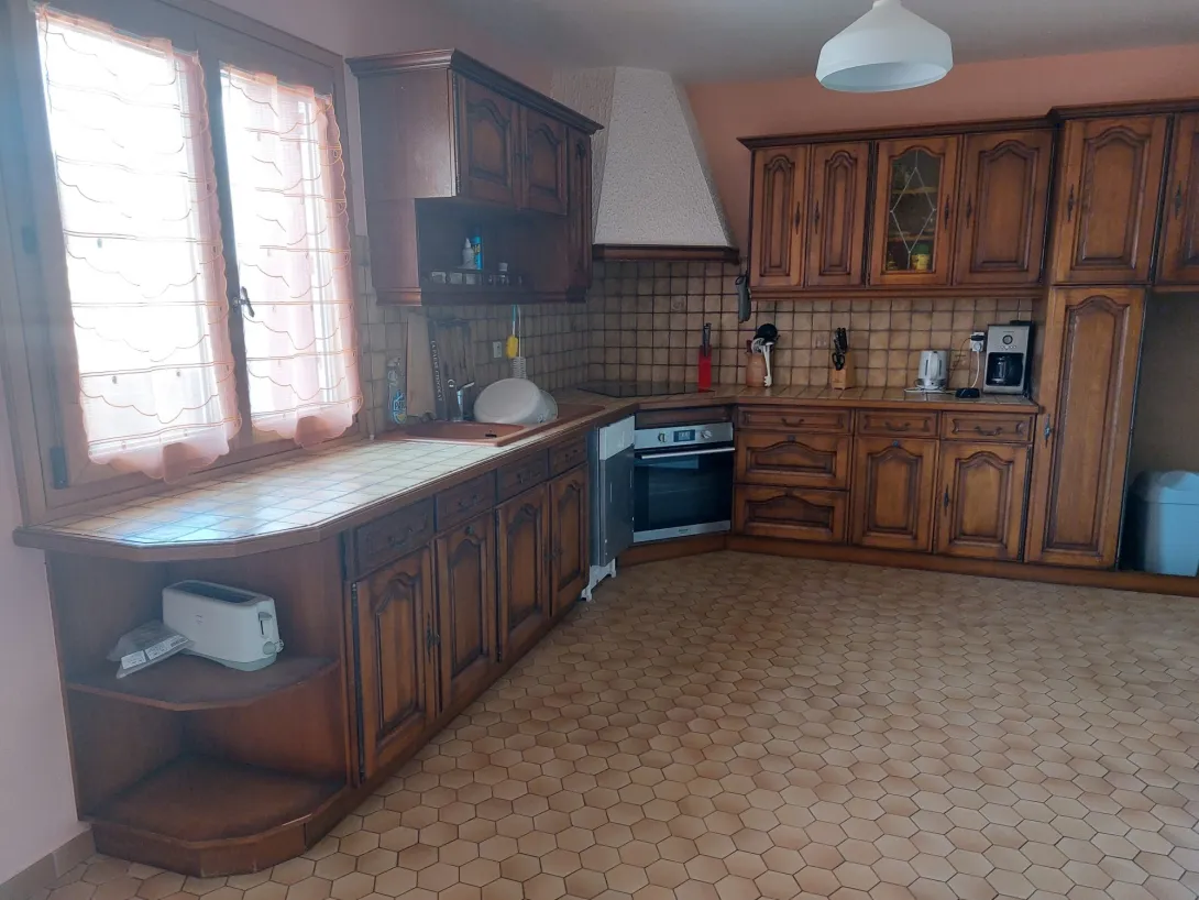 En hameau, maison de 98 m² comprenant une pièce de vie avec une cheminée insert, une cuisine aménagée, un couloir desservant trois chambres dont une avec placard, un débarras aménagé de trois grand placards, une salle d'eau avec douche + baignoire et double vasque, un WC indépendant. Grand garage (85 m²) et chaufferie avec salle d'eau et WC. Jardin, double terrasse. Chauffage fuel.